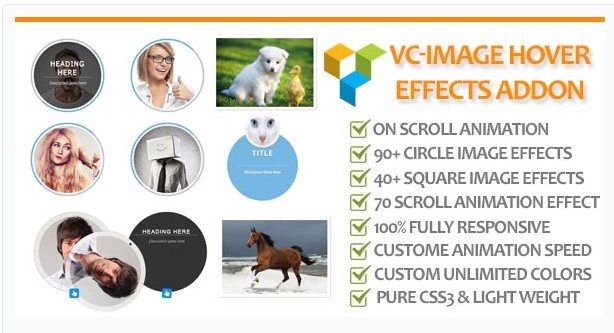 Адд-он для Visual Composer — Эффекты изображения при наведении имеет много эффектов при наведении…это более 100 эффектов анимации прокрутки. Неограниченное количество Фонов и Цветов.Вы можете создавать изображения в круглой и квадратной форме. Полностью адаптивныйи чистый CSS3.Есть возможность установить скорость анимации.