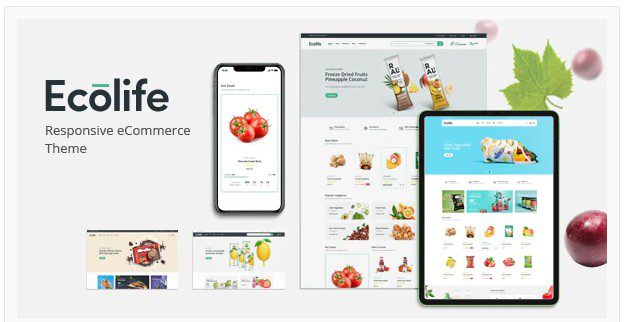 Ecolife — Адаптивная тема WordPress для органических продуктов питания прекрасно разработана и идеально подходит для любого интернет-магазина супермаркета, магазина продуктов питания и напитков, свежих продуктов, органических продуктов, овощного магазина. Благодаря 100% адаптивному веб-дизайну, тема Ecolife WordPress сделает ваш магазин потрясающим, профессиональным и легко настраиваемым на любых устройствах.