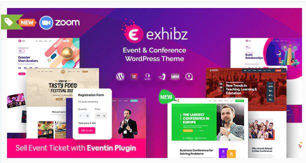 Exhibz — это креативное и современное мероприятие, тема WordPress для конференций для организации встреч, семинаров, кулинарных фестивалей, образовательных конференций, мероприятий 2020 года, мест проведения, одиночных мероприятий, многопользовательских мероприятий или любых других мероприятий. Он поставляется с Drag and Drop Elementor Builder, поэтому вы можете легко настроить все, что вам нужно. С помощью плагина Eventin вы можете продавать онлайн-билеты прямо сейчас и управлять веб-семинаром Zoom