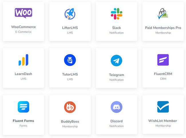 Fluent Support легко интегрируется с популярными приложениями для электронной коммерции, членства, CRM и LMS. Отвечайте клиентам быстрее с Telegram, Slack и Discord.