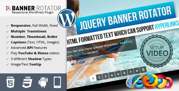 jQuery Баннер Плагин Ротатор На WordPress с несколькими переходами, которые поддерживает текстовые эффекты для заголовков. Миниатюры и кнопки позволяют удобную навигацию ваших баннеров / рекламы.