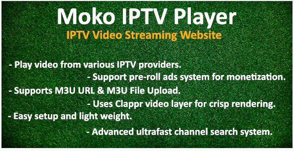 MokoIPTV — это отзывчивый скрипт потокового видео IPTV. Он имеет приятный и привлекательный интерфейс, который действительно привлекателен. Он был разработан как веб-плеер для различных услуг IPTV по всему миру. Большинство услуг IPTV не имеют веб-плеера, поэтому этот скрипт упрощает задачу просмотра вашего IPTV на ходу.