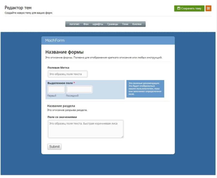 Конструктор любых форм, создаёте поля, логику, дизайн формы, копируете код вставки и вставляете в любой веб-документ, сайт.