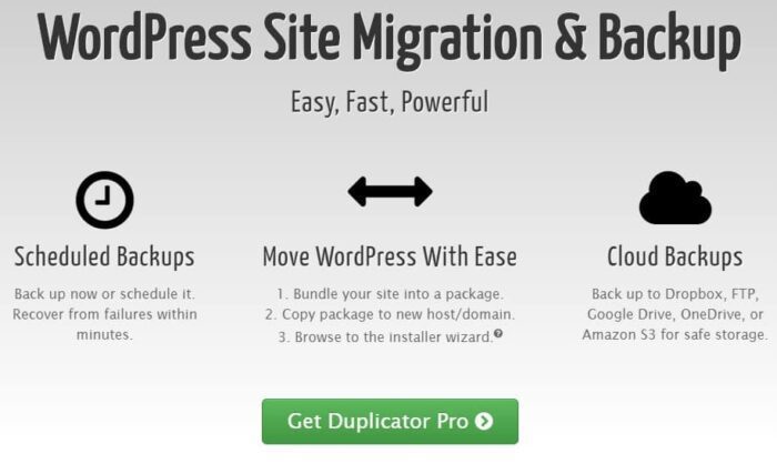 Duplicator Pro – это WordPress плагин для удобной миграции и резервного копирования от разработчиков из Snap Creek. Он выделяется среди других аналогичных плагинов резервными копированиями по расписанию, поэтому Вы сможете сохранить свои данные мгновенно, или отложить резервное копирование. Это даст Вам возможность сделать восстановление после сбоев в течение нескольких минут; переехать WordPress сайтом целиком, что дает возможность упаковать весь сайт в одну сборку, скопировать ее на новый хост или домен и перейти к мастеру установки; облачные резервные сохранения для сохранения на Dropbox, FTP, Google Диске или Amazon S3 для безопасного сохранения данных. Также этот плагин устраняет переделку, поэтому, если Вы устанавливаете ту же тему, плагины или контент на всех Ваших WordPress сайтах, то Duplicator может сэкономить много времени. Вместо того, чтобы вручную настраивать одни и те же темы и плагины снова и снова, просто настройте один сайт и добавьте его в Duplicator сборку. Установите сборку для создания предварительно настроенного сайта. Основные особенности плагина: