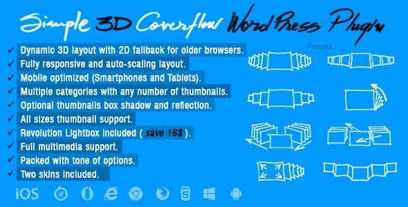 полнофункциональный плагин wordpress слайдера для мультимедиа, который позволяет отображать мультимедийный контент с уникальной оригинальной компоновкой с 3D-перспективами. Он идеально подходит для любой презентации, для тех, кто хочет оказать большое влияние на своих посетителей. Он работает на всех основных браузерах и мобильных устройствах, таких как iPhone , iPad , IOS , Android и Windows . При нажатии на миниатюру вы можете ничего не делать, отображать мультимедийный контент с помощью наших великолепных лайтбоксов или открывать новую веб-страницу. Лайтбокс поддерживает изображение , видео (mp4), аудио(mp3),Vimeo , YouTube , iFrame , карты Google и flash . Простой 3D Coverflow WordPress Plugin имеет высокую производительность с использованием кода OOP и новейших технологий CSS , готовых для мобильных устройств, очень гибких, простых в настройке и чрезвычайно настраиваемых.