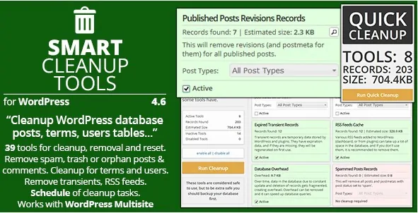 Умные Инструменты Очистки сайта являются удобным, мощным плагином для очищения базы данных с общим количеством 38 чисток, сброса и инструментов удаления. С этим плагином можно удалить данные, которые больше не находятся в использовании, или это является ненужным.