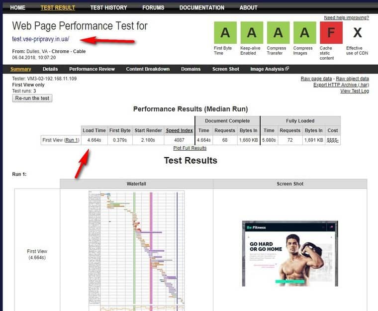 Загрузил на свой тестовый сайт этот же шаблон — FITNESS, подключил только те плагины, которые идут в архиве с темой, никаких кеширующих или ускоряющих не ставил, и протестировал: