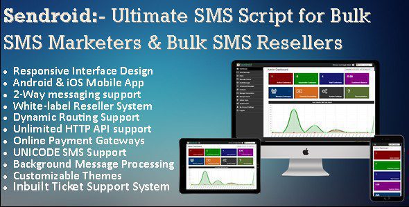 В дополнение к супер отзывчивому пользовательскому интерфейсу и богатой графике, Sendroid Ultimate содержит удивительные инструменты и функции, такие как; SMS-чат, система реселлеров White-Label, контроль спама, фильтрация контента, поддержка динамического / статического идентификатора отправителя, отключение SMS-шлюза, часовые ограничения SMS-шлюза, динамическая маршрутизация, перепродажа коротких кодов, планы SMS, SMS-ваучеры, вход в Facebook, reCaptcha, Надежные API-интерфейсы и множество других инструментов, разработанных, чтобы идеально вписаться в любой бизнес по массовым рассылкам SMS, независимо от вашей бизнес-модели.
