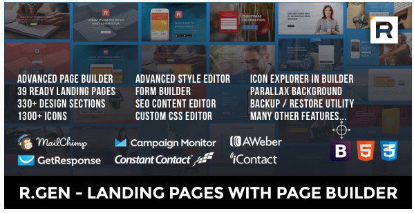Целевые страницы RGen являются многоцелевыми маркетинговыми страницами, 35 + готовых к использованию демо-примеров с drag-and-drop редактором (перетащил и вбросил) усовершенствованный разработчик страницы включая 300 + разделов проекта.