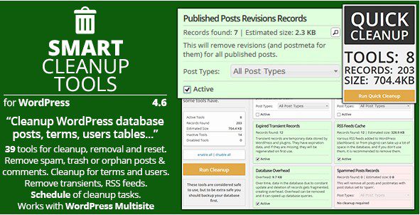 Умные Инструменты Очистки сайта являются удобным, мощным плагином для очищения базы данных с общим количеством 38 чисток, сброса и инструментов удаления. С этим плагином можно удалить данные, которые больше не находятся в использовании, или это является ненужным.