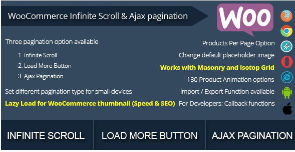 WooCommerce Бесконечная прокрутка и Ajax Разбивка на страницы — это в WordPress(woocommerce) плагин предназначен для преобразования продуктов по умолчанию разбиение на страницы в бесконечной прокрутки или AJAX пагинация с woocommerce ленивый загрузки. Когда пользователь прокручивает в нижней части страницы, Следующая страница продукты автоматически извлекается и добавляется. Это означает, что пользователь никогда не должен нажать “Следующая страница”. Все продукты появляются на прокрутке вниз.