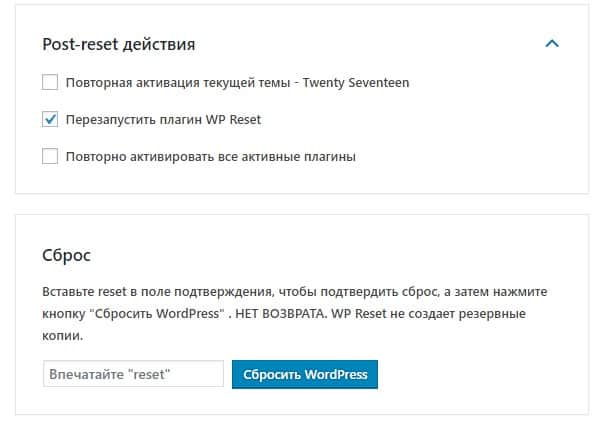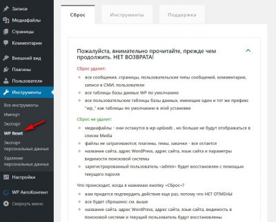 Сам плагин WP Reset не сбрасывается при сбросе и остаётся активным.