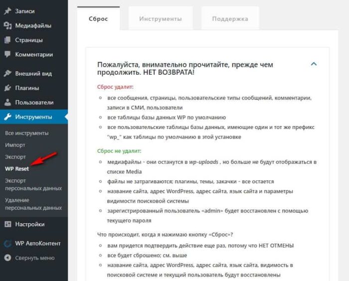 Пожалуйста, внимательно прочитайте, прежде чем переходить к пониманию того, что делает WP Reset.